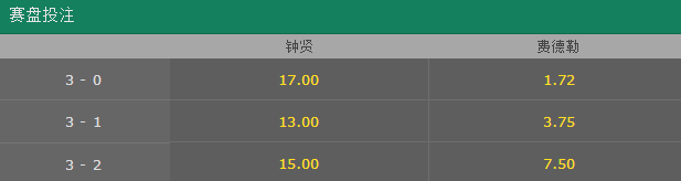 對陣韓國新星鄭泫,而從本場賠率來看,費德勒取勝低至1賠1.12,鄭泫取勝則為1賠6.00